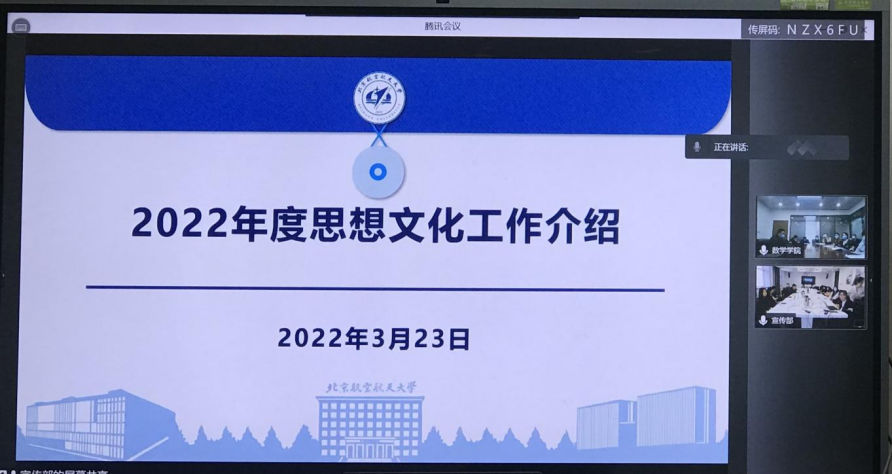 2022年3月23日下午,宣传部党支部与我院机关党支部举行“学习日”联学活动。宣传部部长李建伟、副部长余敏、孙也程和党委宣传部党支部党员,新葡的京集团350vip8888党委书记袁星、机关党支部党员和各系党支部宣传委员等25人参加本次活动。活动以两校区两会场间视频会议的形式展开。学习活动由新葡的京集团350vip8888党委书记袁星主持。