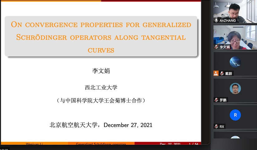 2021年12月27日下午,西北工业大学李文娟教授,应邀为新葡的京集团350vip8888师生做了题为 “Convergence properties for generalized Schrödinger operators along tangential curves”的学术报告,报告由张安老师主持。