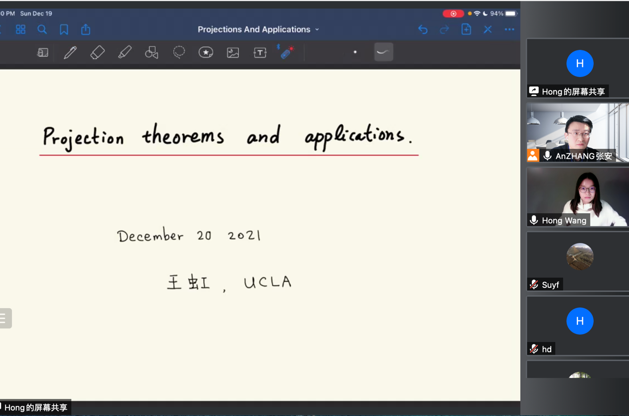 2021年12月20日下午,加州大学洛杉矶分校王虹教授,应邀为新葡的京集团350vip8888师生做了题为 “Projection theorems and applications”的学术报告,报告由张安老师主持。