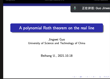 2021年10月18日下午,中国科学技术大学郭经纬教授,应邀为新葡的京集团350vip8888师生做了题为 “A polynomial Roth theorem on the real line”的学术报告,报告由张安老师主持。