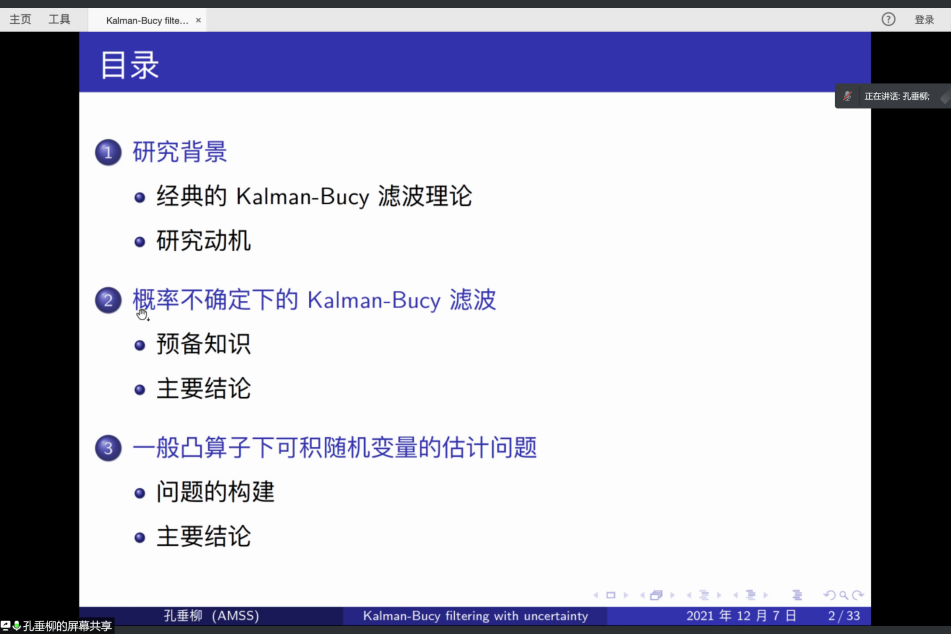 2021年12月7日,中国科学院数学与系统科学研究院系统所博士后孔垂柳博士应罗雪老师的邀请,通过线上的方式为统计与运筹系师生做了一场主题为“Kalman-Bucy filtering and minimum mean square estimator under uncertainty”的学术报告。