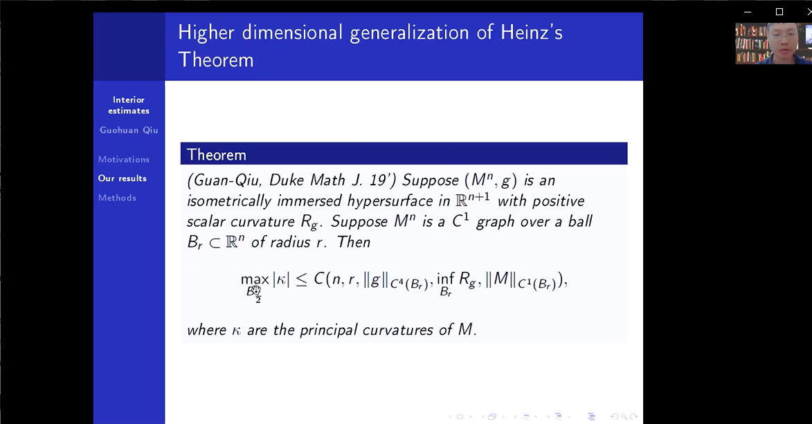 2021年4月29日上午,香港中文大学助理教授邱国寰应胡鹰翔老师的邀请,为新葡的京集团350vip8888师生带来了一场题为“Interior estimate for scalar curvature equations”的学术报告。报告由胡鹰翔老师主持。