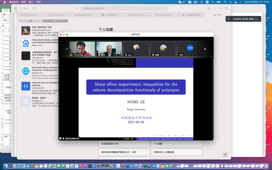 2021年4月30日上午,同济大学数学学院熊革教授受邀为新葡的京集团350vip8888师生做了题为“Sharp affine isoperimetric inequalities for the volume decomposition functionals of polytopes”的线上学术报告,报告由张世金老师主持。此报告为数学学院几何团队每周五上午讨论班的学术报告。