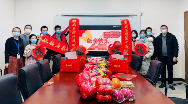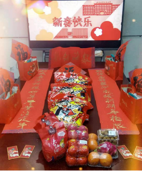 “新春大礼包”由新春红包(食堂餐券)、过年大礼包(水果、食品)和爱心防疫包(口罩、消毒湿巾)组成,专门定制的数学文化春联——“点线面体聚沙成塔科研无极限”“加减乘除神机妙算学业注定牛”,祝福全体同学们新的一年学业有成。