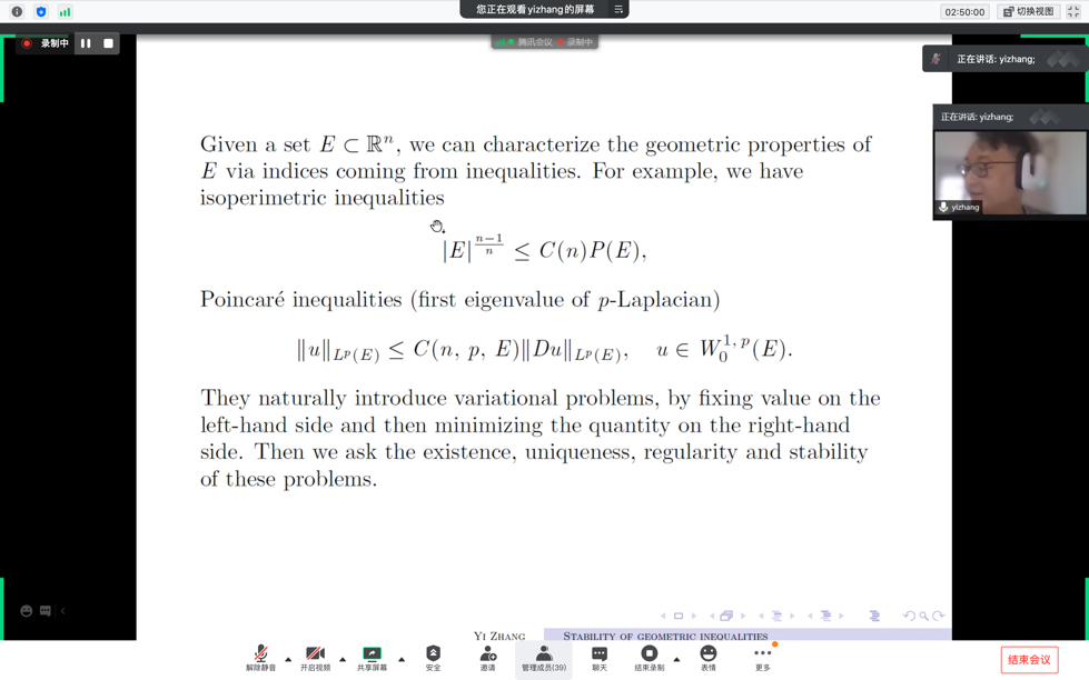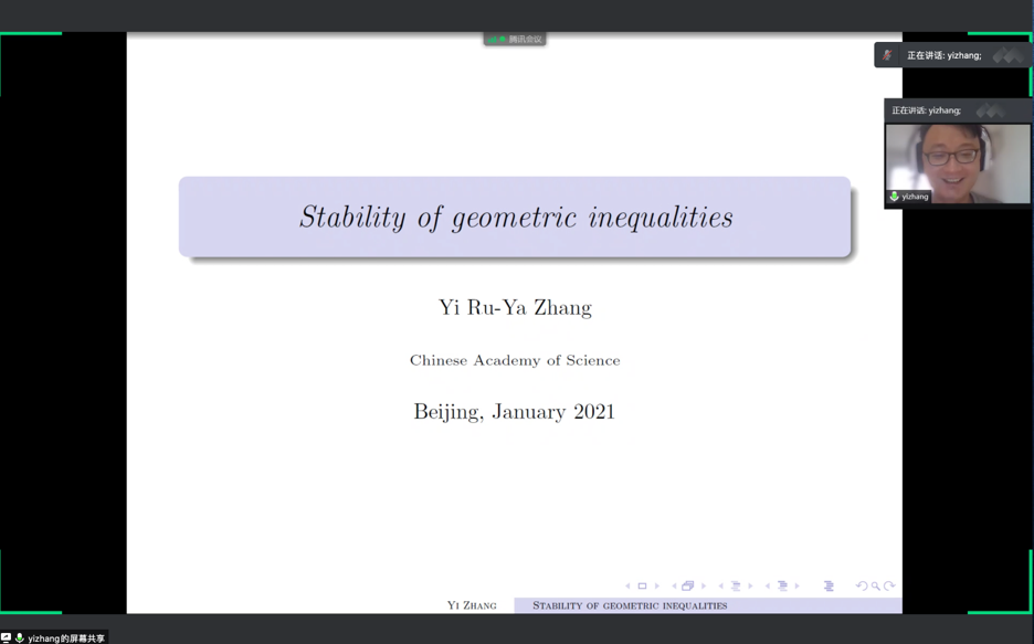 2021年1月13日下午,中科院数学所张翼副研究员,应邀为新葡的京集团350vip8888师生做了题为“Stability of geometric inequalities”的线上学术报告,报告由张安老师主持。