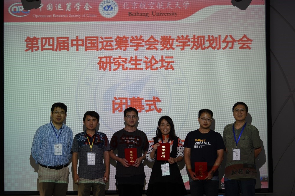 9月23日下午学术报告结束后,举行了简短的闭幕式,由北京航空航天大学数学与系统科学学院夏勇教授主持。本次论坛从23位研究生报告中评选出三位优秀成果奖,香港中文大学的刘慧康、浙江大学的甘进翔、中国科学院数学与系统科学研究院的陈雅丹获此殊荣。由文再文研究员、夏勇教授、刘亚锋研究员分别颁发优秀成果奖证书,每位获奖者另有奖金1000元以资鼓励,由杉树科技公司特别赞助。最后在与会代表的热烈掌声中,本次研究生论坛圆满结束。