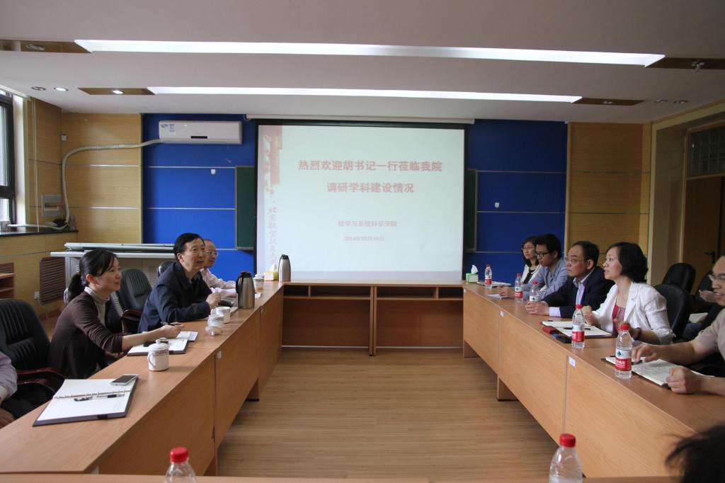 5月16日下午胡凌云书记一行到我院调研,重点了解了学院学科建设情况。研究生院学科建设处处长李波,人事处副处长唐莉,党委常委会秘书王喜忠,数学学院院班子成员、学科建设带头人、系主任、院长助理等出席了座谈会。